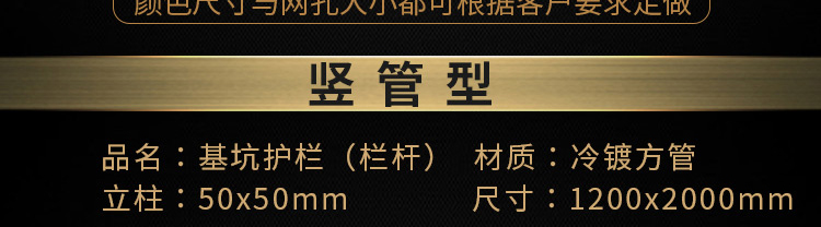 建筑基坑護欄是使用網(wǎng)片或豎管與邊框焊接而成,*常用的尺寸為1.2*2m,表面進行噴塑或噴漆處理,顏色可選為紅白或黑黃相間的警示色,在基坑護欄的中部可焊接鐵皮噴涂“嚴禁拋物、禁止翻越”的警示標語,下部可加設(shè)15-20cm的踢腳板,顏色可選擇黑紅或紅白相間的涂料。